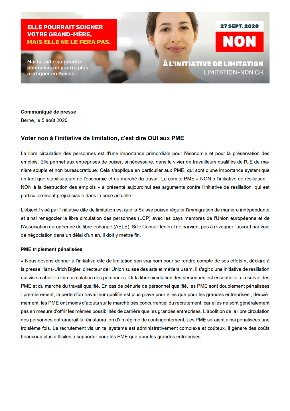 Avec son comité PME «Non à l'initiative de résiliation – Non à la destruction des emplois», l'Union suisse des arts et métiers usam fait campagne contre l'initiative de limitation. Cette initiative, qui est en réalité une initiative de résiliation, mérite un rejet catégorique dans les urnes le 27 septembre prochain. Voter non, c'est dire oui à la prospérité et aux PME, qui sont les piliers de notre système économique.